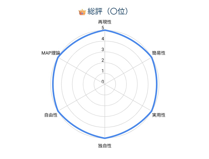というわけで私は以下の6つの軸を5段階で評価し、総評として以下のレーダーチャートを提示します。