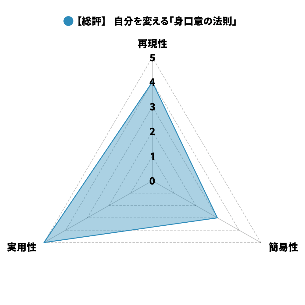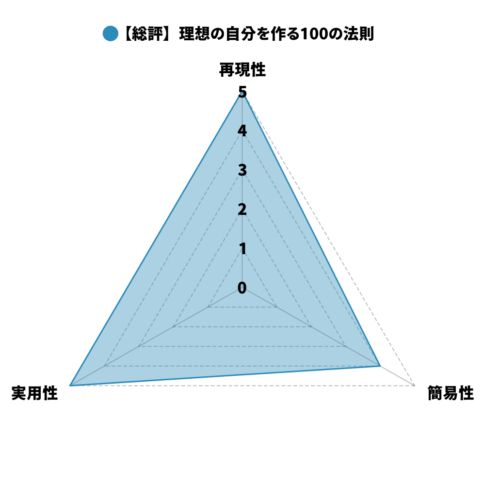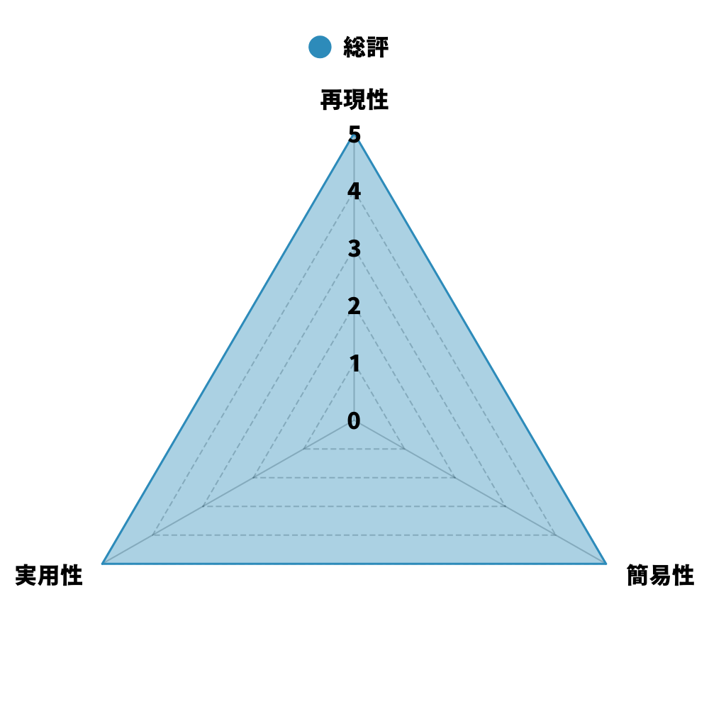 以下の3つの軸を5段階で評価し、総評として以下のレーダーチャートを提示します。